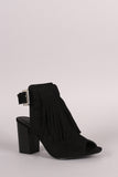 This fringe detail at front, and chunky stacked heel. Finished with lightly padded insole and adjustable ankle strap with buckle fastening.