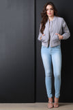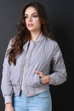 This trendy bomber jacket features a zip up front, long sleeves with pens and zipper pocket at left sleeves, button side pockets, ribbed knit trimming, and fully lined. Accessories sold separately. 100% Polyester. Rib: 95% Polyamide, 5% Spandex.