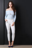 A ribbed knit bodysuit featuring an off-the-shoulder design with long fitted sleeves and a double snap button closure at the crotch. Accessories sold separately. Made in U.S.A. 48% Polyester, 48% Rayon, 4% Spandex.