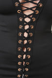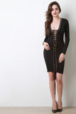 This bodycon midi dress features a full length self lace up front design with metallic grommets, v-neckline and long sleeves. Accessories sold separately. Made in U.S.A. 95% Polyester, 5% Spandex.