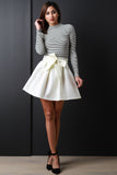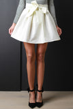 This mini skirt features pleated taffeta, a-line cut, bow accent, and hidden side zipper closure. Accessories sold separately. Made in U.S.A. 90% Polyester, 10% Spandex.