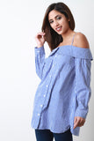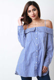 This top features a bardot neckline with flap collar, removable adjustable spaghetti shoulder straps, button-up front, long button cuff sleeves, breast pockets, shift cut fit, and vertical stripe design. Accessories sold separately. 100% Cotton.