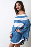This chambray dress features an elasticized bardot neckline, long bell sleeves, shift cut fit, and contrasting stripe panel seams accent. Accessories sold separately. 100% Cotton. Contrast: 95% Cotton, 5% Spandex.