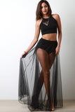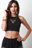 This sleeveless jersey knit top features a cutaway front, racer back, round neckline, and crop hemline. Accessories sold separately. Made in U.S.A. 95% Cotton, 5% Spandex.