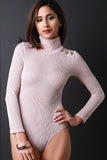 This bodysuit features a ribbed knit fabrication, turtle neckline, long sleeves, 3-button d�cor at left shoulder, brief bottom, and double snap button closure at crotch. Accessories sold separately. Made in U.S.A. 65% Polyester, 35% Rayon.