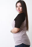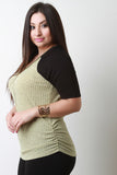 This plus size top features a marled knit fabrication with contrasting solid knit short raglan sleeves, v-neckline, zip up front, and side cinched detail. Accessories sold separately. Made in U.S.A. 97% Rayon, 3% Spandex.