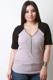 Zip Up Marled Knit Contrast Short Sleeves Top