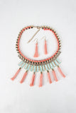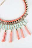 This statement necklace features string-wrapped gold-tone studs, rhinestone and gem accents, fringe tassels, and adjustable lobster hook closure. Finished with matching earrings.