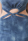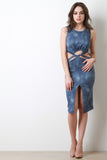 This midi dress features denim print stretch fabric, round neckline, sleeveless, and cut out midriff design. Finished with a front thigh high slit. Accessories sold separately. Made in U.S.A. 95% Polyester, 5% Spandex.