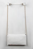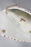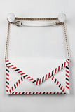 This vegan leather crossbody clutch has an envelop print design on the front, with a magnetic button closure. Includes removable crossbody chain. Finished with an interior zipper pocket. (Drop 19" approx)