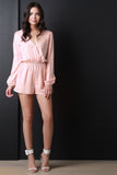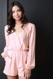 This pretty romper features a surplice neckline with single button closure, long bell sleeves with thin banding, elasticized waistline, and two front pockets. Accessories sold separately. 100% Rayon.