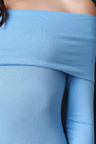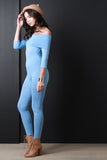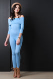 This jersey knit jumpsuit features a bardot neckline with a cuff down collar, quarter-length sleeves, and taper leggings. Accessories sold separately. Made in U.S.A. 95% Rayon, 5% Spandex.