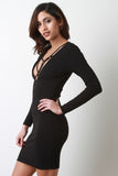 This strappy bodycon dress features a plunging v-neckline with caged yoke construction, long sleeves, sculpture fit, princess seam, and texture knit fabrication. Accessories sold separately. Made in U.S.A. 92% Polyester, 8% Spandex.