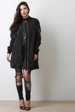 This bomber jacket features a longline construction, zipper front, drawstring hemline, ribbed knit collar, side pockets,, long sleeves with pen and zipper pocket, completed with lining. Accessories sold separately. 100% Polyester.