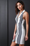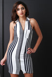 This sleeveless  stripe  knit fabrication, double breast pockets, half placket v-neckline with spread collar, and exposed front-zip closure. Accessories sold separately. 65% Rayon, 35% Polyester.
