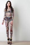 This semi-sheer mesh jumpsuit features a multi color tribal print throughout, a round neckline, and keyhole back with a single button closure. Finished with long sleeves and fitted legs. Accessories sold separately. Made in U.S.A. 100% Polyester.
