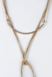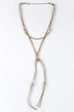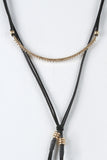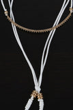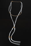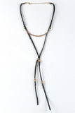 This  necklace  features knotted vegan suede cords, gold-tone beads, embossed crescent shaped bar, and adjustable lobster hook closure.
