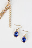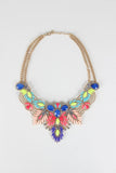 This bib necklace features gold-tone frame, double-stranded chains, rhinestone and gem design, and adjustable lobster hook closure. Finished with matching earrings.