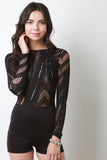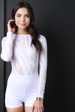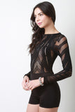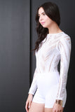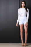 This alluring romper features a contrast patterned lace top, crew neckline, long sleeves, half button shorts, and back-zip closure. Accessories sold separately. Made in U.S.A. 98% Polyester, 2% Spandex.