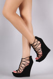 This lovely platform wedge features an elasticized strappy caged silhoutte, smooth nubuck upper, peep toe, and wedge heel. Finished with a lightly padded insole and a zip-up back closure.