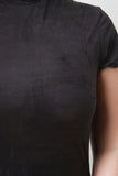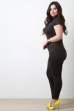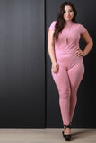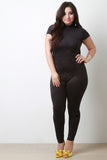 This plus size jumpsuit features soft faux suede, mock neckline, and short sleeve construction. Finished with a back zipper fastener and taper cut legs. Accessories sold separately. Made in U.S.A. 95% Polyester, 5% Spandex.