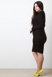 This plus size dress features a ribbed knit fabrication, long sleeves, a mock neckline, and a crisscross design in the front. Finished with a midi hemline. Accessories sold separately. 97% Rayon, 3% Spandex.