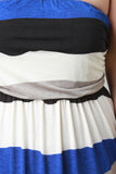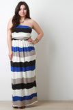 This plus size maxi dress features a horizontal stripe design fabrication throughout, strapless and a ruched elasticized tube neckline. Finished with a cinched waist. Accessories sold separately. 90% Polyester, 10% Spandex.