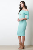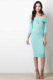 This dress features ribbed knit fabrication, an off the shoulder neckline, and three quarter sleeves.Finished with a midi hemline. Accessories sold separately. Made in U.S.A. 95% Polyester, 5% Spandex.