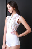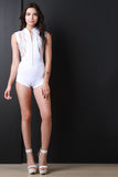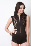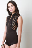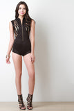 This trendy romper features smooth stretch knit, abstract pattern mesh, front zipper closure, and sleeveless construction. Accessories sold separately. Made in U.S.A. 90% Polyester, 10% Spandex.