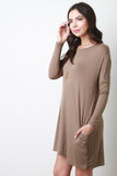 This jersey knit shift dress features a round neckline, long dolman sleeves, and hidden side pockets. Accessories sold separately. Made in U.S.A. 95% Rayon, 5% Spandex.