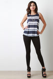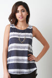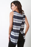 This stripe knit fabrication, round neckline, tulip open back design, and a high low hemline. Accessories sold separately. Made in U.S.A.  57.5% Rayon, 42.5% Polyester.