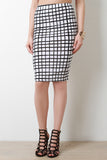 This midi skirt features a stretchy grid print knit fabrication, curve-hugging silhoutte, and hidden elasticized waistline. Accessories sold separately. Made in U.S.A. 95% Polyester, 5% Spandex.