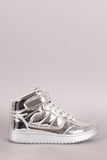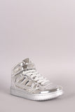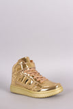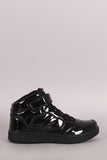This street-cool high top sneaker features a mirror-like patent upper, round toe silhouette, top stitching details, and lace up front with single strap closure. Finished with cushioned insole, padded collar, and tongue for all day comfort.