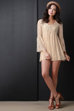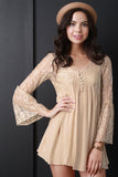 This two piece dress features a detachable spaghetti strap lined dress, lace fabrication, v-neckline with buttons, long bell sleeves and a mini shift hemline. Accessories sold separately. 100% Rayon.