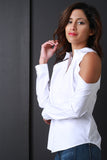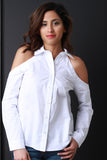 This shirt features a classic shirt collar, cold shoulder long sleeves construction with double button cuffs and button-up front. Finished with a round hemline. Accessories sold separately. 100% Cotton.