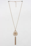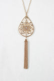 This pendant necklace features a teardrop charm with a scroll flower, rhinestones and a chain tassel. Adjustable lobster claw closure.