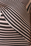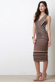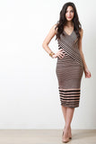 This jersey knit dress features a v-neckline, sleeveless design, various size stripes, horizontal pattern with diagonal bodice, and midi length hemline. Accessories sold separately. Made in U.S.A. 95% Rayon, 5% Spandex.