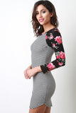 This bodycon dress features a round neckline, long floral raglan sleeves, ribbed knit striped bodice, and rounded hemline. Accessories sold separately. Made in U.S.A. 48% Polyester, 48% Rayon, 4% Spandex.