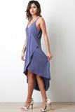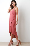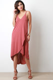 This jersey knit dress features a v-neckline, double spaghetti shoulder straps to a crisscross back, tulip front and a high low hemline. Accessories sold separately. 64% Modal, 38% Polyester.