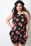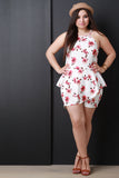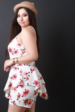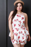 This flirty plus size romper features textured stretch knit, floral print, spaghetti straps, and skort bottom. Accessories sold separately. 96% Polyester, 4% Spandex.