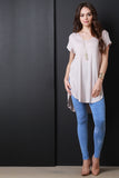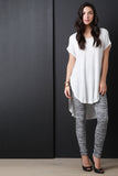 This casual top features a lightweight textured fabrication, scoop neckline, and short dolman sleeves. Finished with a high-low round hemline. Accessories sold separately. Made in U.S.A. 95% Rayon, 5% Spandex.