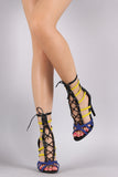 This stunning open toe heel features a strappy caged construction with colorblock design, snake embossed detail, corset-style lace-up front, and wrapped stiletto heel. Finished with lightly padded insole and rear zipper closure for easy on/off.