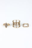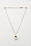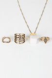 This ring set features a raw quarts cube pendant with a gold dipped top, dainty chain with beads and adjustable lobster claw closure. Three rings, one ring with an laser cut cage design, a diamond shaped engraved metal detail ring, and a small ring with a x detail. non-adjustable bands.