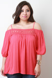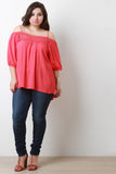 This bohemian inspired plus size top features a off the shoulder neckline, spaghetti straps, a crochet inset, elastic hemmed in the sleeves and neckline, a high low hem, light weight weave fabrication. Accessories sold separately. 100% Rayon.