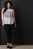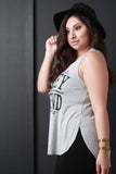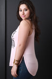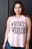 This plus size tank top features a "Whiskey Weekend" graphic print, sleeveless construction, rounded neckline, high low rounded hem line, and a soft knit fabrication. Accessories sold separately. 97% Rayon 3% Spandex.