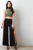 These palazzo pants feature an elastic waistband, wrap leg design, slit, flare cut, and a soft knit fabrication. Accessories sold separately. 95% Rayon, 5% Spandex.