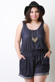 This denim throughout, scooped neck, elasticized waistline with adjustable drawstring, two side pockets, and cuffed hem shorts. Accessories sold separately. 92% Polyester, 8% Spandex.