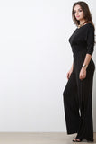 This jumpsuit features flowy soft knit fabrication, scoop neckline, bat wing half sleeves, gathering details at the waistband, wide leg flowy pant. Accessories sold separately. Made in U.S.A. 95% Polyester, 5% Spandex.