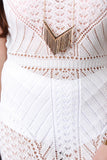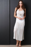 This crochet maxi dress features a pattern eyelet knit design, adjustable spaghetti shoulder straps, and vent slit sides. Accessories sold separately. 60% Cotton, 40% Rayon.