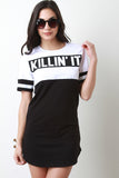This t-shirt dress features a round neckline, short sleeves, contrasting crop seam with "Killin' It" screen print design, and a rounded high low hemline. Accessories sold separately. Made in U.S.A. 95% Cotton, 5% Lycra.